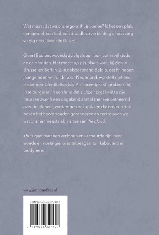 In 'Thuis', een poëziebundel van Geert Buelens, stelt de dichter de vraag wat maakt dat we ons ergens thuis voelen. Is het een plek, een gevoel, een taal, een draadloze verbinding of een zorgvuldig gecultiveerde illusie? 'Thuis' gaat over een verlopen en verbeurde tijd, over woede en nostalgie, over tatoeages, tuinkabouters en teddyberen. Geert Buelens woonde de afgelopen tien jaar in vijf steden en drie landen en is dus de aangewezen persoon om poëzie te schrijven over ontheemding. Zijn eerste dichtbundel 'Het is' werd bekroond met de Lucy B. en C.W. van der Hoogtprijs en genomineerd voor de C. Buddingh'prijs.