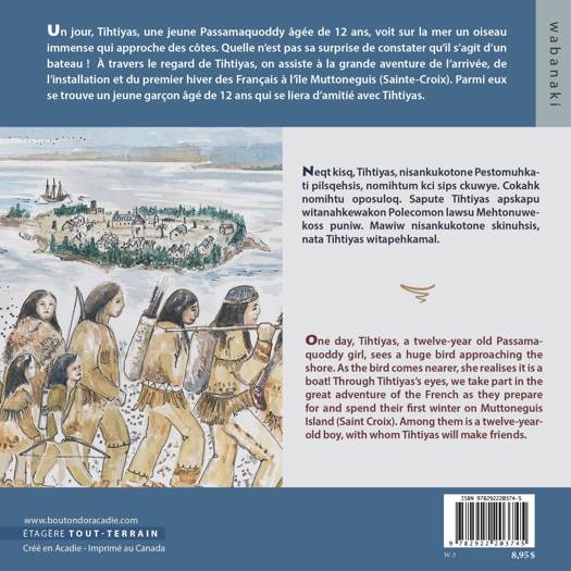 One day, Tihtiyas, a twelve-year old Passamaquoddy girl, sees a huge bird approaching the shore. As the bird comes nearer, she realises it is a boat! Through Tihtiyas's eyes, we take part in the great adventure of the French as they prepare for and spend their rst winter on Muttoneguis Island (Saint Croix). Among them is a twelve-year old boy, with whom Tihtiyas will make friends.