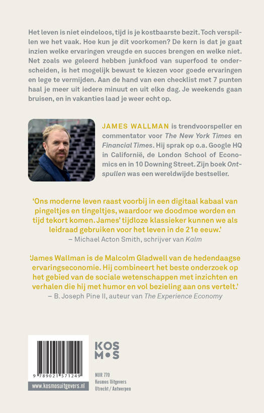 In 'Tijd en hoe die te besteden' legt James Wallman ons uit hoe we kunnen voorkomen dat we onze tijd verspillen. Tijd is immers ons kostbaarste bezit. We kunnen dit voorkomen door te begrijpen welke ervaringen vreugde en succes brengen en welke niet. James Wallman legt uit dat het mogelijk is om bewust te kiezen voor goede ervaringen en lege ervaringen te vermijden. O.a. met bruisende weekends en vakanties om op te laden.