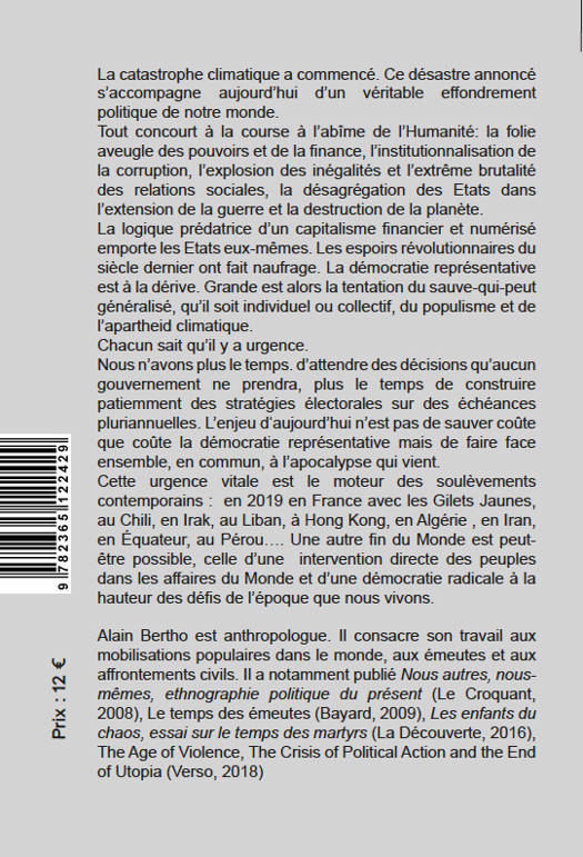 La catastrophe climatique a commencé. Tout concourt à la course à l'abîme de l'Humanité: la folie aveugle des pouvoirs et de la finance, l'institutionnalisation de la corruption, l'explosion des inégalités et l'extrême brutalité des relations sociales, la désagrégation des Etats dans l'extension de la guerre et la destruction de la planète. La logique prédatrice d'un capitalisme financier et numérisé emporte les Etats eux-mêmes. Les espoirs révolutionnaires du siècle dernier ont fait naufrage. La démocratie représentative est à la dérive. Grande est alors la tentation du sauve-qui-peut généralisé, qu'il soit individuel ou collectif. Chacun sait qu'il y a urgence. Nous n'avons plus le temps. d'attendre des décisions qu'aucun gouvernement ne prendra, plus le temps de construire patiemment des stratégies électorales sur des échéances pluriannuelles. Une autre fin du Monde est peut-être possible, celle d'une intervention directe des peuples dans les affaires du Monde.