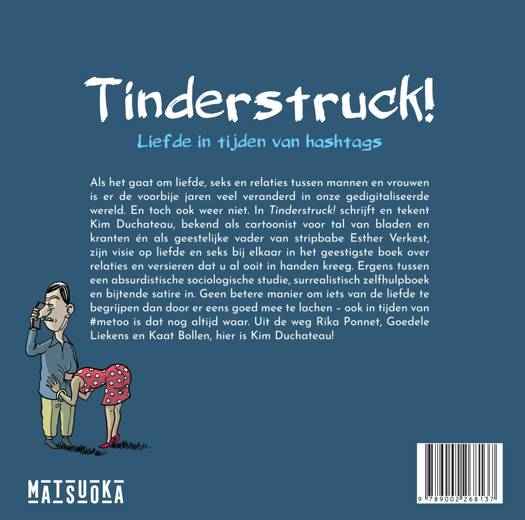 Als het gaat om liefde, seks en relaties tussen mannen en vrouwen is er de voorbije jaren veel veranderd in onze gedigitaliseerde wereld. En toch ook weer niet. In Tinderstruck! schrijft en tekent Kim Duchateau, bekend als cartoonist voor tal van bladen en kranten én als geestelijke vader van stripbabe Esther Verkest, zijn visie op liefde en seks bij elkaar in het geestigste boek over relaties en versieren dat u al ooit in handen kreeg. Ergens tussen een absurdistische sociologische studie, surrealistisch zelfhulpboek en bijtende satire in. Geen betere manier om iets van de liefde te begrijpen dan door er eens goed mee te lachen – ook in tijden van #metoo is dat nog altijd waar. Uit de weg Rika Ponnet, Goedele Liekens en Kaat Bollen, hier is Kim Duchateau!