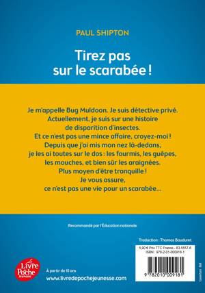 Je m'appelle Bug Muldoon. Je suis détective privé. Actuellement, je suis sur une histoire de disparition d'insectes. Et ce n'est pas une mince affaire, croyez-moi ! Depuis que j'ai mis mon nez là-dedans, je les ai toutes sur le dos : les fourmis, les guêpes, les mouches, et bien sûr, les araignées. Plus moyen d'être tranquille ! Je vous assure, ce n'est pas une vie pour un scarabée.