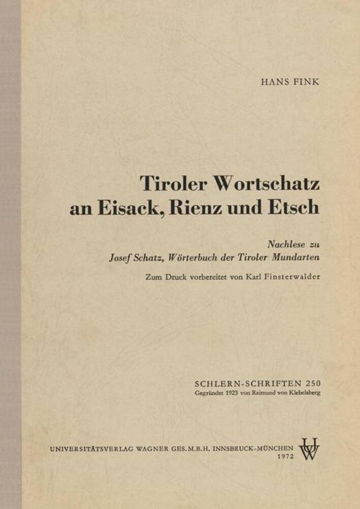 Eine Nachlese zu Josef Schatz' "Wörterbuch der Tiroler Mundarten": Akribisch stellt der Autor Hans Fink weitere Ausdrücke bairisch-tirolischer Mundart aus den Landschaften um Eisack, Rienz und Etsch zusammen, die bei Josef Schatz' unerwähnt blieben. Er ergänzt damit die Sammlung von Mundartbegriffen weiter.