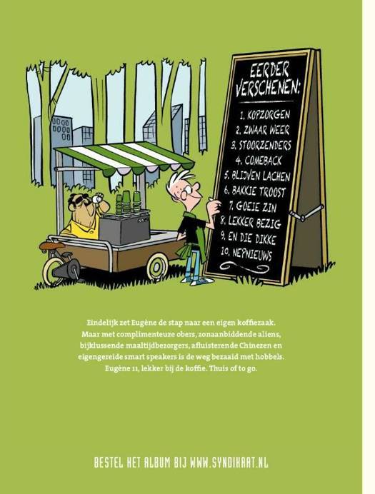 Eindelijk zet Eugène de stap naar een eigen koffiezaak. Maar met complimenteuze obers, zonaanbiddende aliens, bijklussende maaltijdbezorgers, afluisterende Chinezen en eigengereide smart speakers is de weg bezaaid met hobbels. Eugène 11, lekker bij de koffie. Thuis of to go.