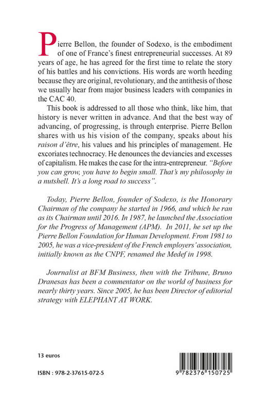 This book is addressed to all those who think, like him, that history is never written in advance. And that the best way of advancing, of progressing, is through enterprise. Pierre Bellon shares with us his vision of the company, speaks about his raison d'être, his values and his principles of management. He excoriates technocracy. He denounces the deviancies and excesses of capitalism. He makes the case for the intra-entrepreneur. « Before you can grow, you have to begin small. That's my philosophy in a nutshell. It's a long road to success ».