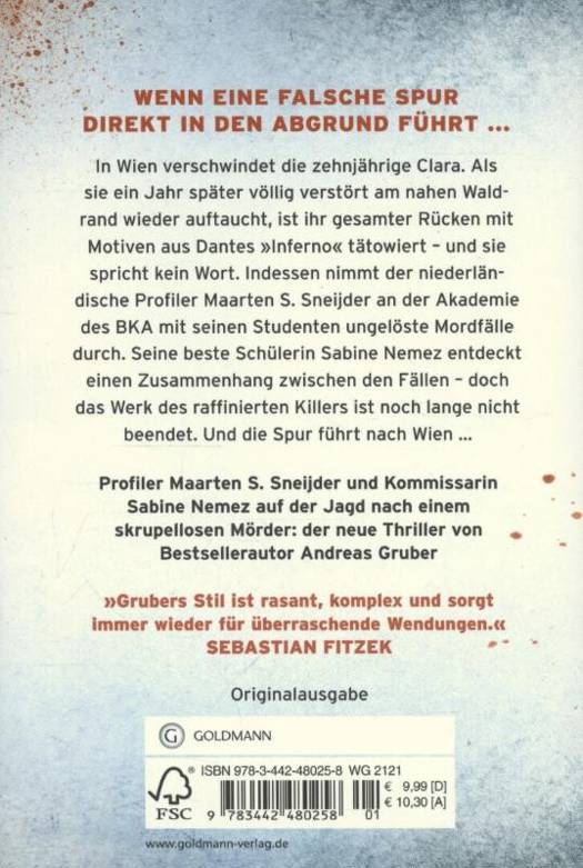 Sneijder und Nemez ermitteln wieder.In Wien verschwindet die zehnjährige Clara. Ein Jahr später taucht sie völlig verstört am nahen Waldrand wieder auf. Ihr gesamter Rücken ist mit Motiven aus Dantes "Inferno" tätowiert - und sie spricht kein Wort. Indessen nimmt der niederländische Profiler Maarten S. Sneijder an der Akademie des BKA für hochbegabten Nachwuchs mit seinen Studenten ungelöste Mordfälle durch. Seine beste Schülerin Sabine Nemez entdeckt einen Zusammenhang zwischen mehreren Fällen - aber das Werk des raffinierten Killers ist noch lange nicht beendet. Seine Spur führt nach Wien - wo Clara die einzige ist, die den Mörder je zu Gesicht bekommen hat ...