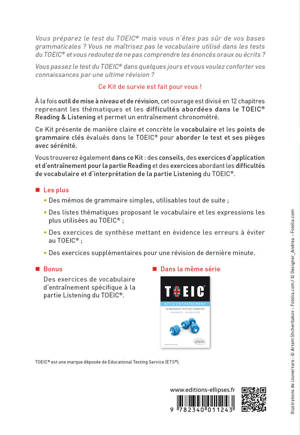 Ce Kit présente de manière claire et concrète le vocabulaire et les points de grammaire clés évalués dans le TOEIC® pour aborder le test et ses pièges avec sérénité.