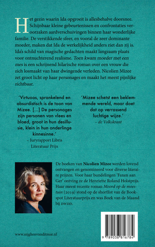 Het gezin waarin Ida opgroeit is allesbehalve doorsnee. Schijnbaar kleine gebeurtenissen en confrontaties veroorzaken aardverschuivingen binnen haar wonderlijke familie. De verstikkende sfeer, en vooral de zeer dominante moeder, maken dat Ida de werkelijkheid anders ziet dan zij is. Ida’s schild van magische gedachten maakt langzaam plaats voor ontnuchterend realisme. Toen kwam moeder met een mes is een schrijnend hilarische roman over een vrouw die zich losmaakt van haar dwingende verleden. Nicolien Mizee zet groot licht op haar personages en maakt het meest pijnlijke zichtbaar.