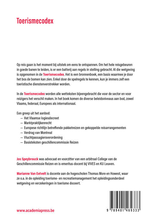 Op reis gaan is het moment bij uitstek om eens te ontspannen. Om het hele reisgebeuren in goede banen te leiden, is er een batterij aan regels in stelling gebracht. Al die wetgeving is opgenomen in de Toerismecodex. Het is een bronnenboek, een basis waarmee je door het bos de bomen kan zien. Enkel door de spelregels te kennen, kun je immers zelf een toeristische dienstenverstrekker worden.