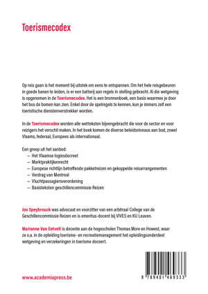 In de Toerismecodex worden alle wetteksten bijeengebracht die voor de sector en voor reizigers het verschil maken. In het boek komen de diverse beleidsniveaus aan bod, zowel Vlaams, federaal, Europees als internationaal.
