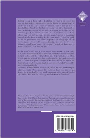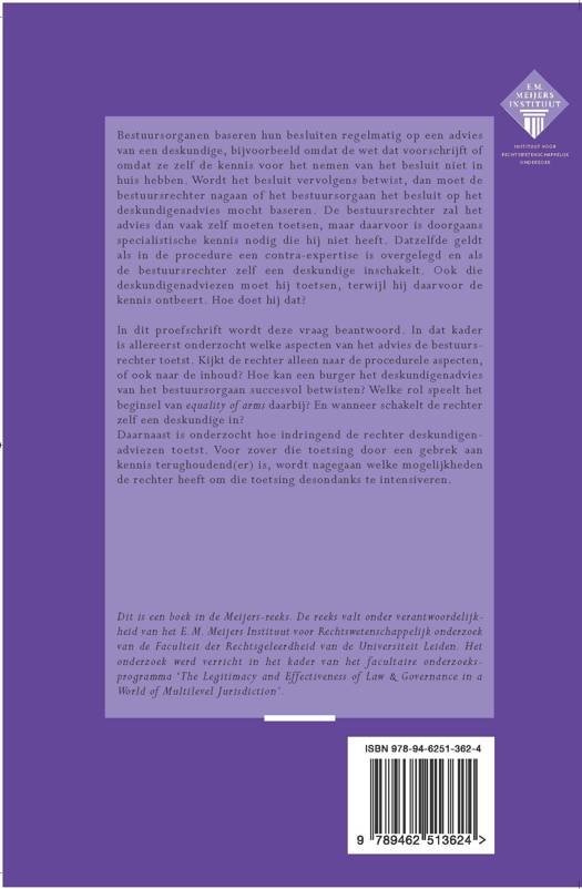 Bestuursorganen baseren hun besluiten regelmatig op een advies van een deskundige, bijvoorbeeld omdat de wet dat voorschrijft of omdat ze zelf de kennis voor het nemen van het besluit niet in huis hebben. Wordt het besluit vervolgens betwist, dan moet de bestuursrechter nagaan of het bestuursorgaan het besluit op het deskundigenadvies mocht baseren. De bestuursrechter zal het advies dan vaak zelf moeten toetsen, maar daarvoor is doorgaans specialistische kennis nodig die hij niet heeft. Datzelfde geldt als in de procedure een contra-expertise is overgelegd en als de bestuursrechter zelf een deskundige inschakelt. Ook die deskundigenadviezen moet hij toetsen, terwijl hij daarvoor de kennis ontbeert. Hoe doet hij dat? In dit proefschrift wordt deze vraag beantwoord. In dat kader is allereerst onderzocht welke aspecten van het advies de bestuursrechter toetst. Kijkt de rechter alleen naar de procedurele aspecten, of ook naar de inhoud? Hoe kan een burger het deskundigenadvies van het bestuursorgaan succesvol betwisten? Welke rol speelt het beginsel van equality of arms daarbij? En wanneer schakelt de rechter zelf een deskundige in? Daarnaast is onderzocht hoe indringend de rechter deskundigenadviezen toetst. Voor zover die toetsing door een gebrek aan kennis terughoudend(er) is, wordt nagegaan welke mogelijkheden de rechter heeft om die toetsing desondanks te intensiveren
