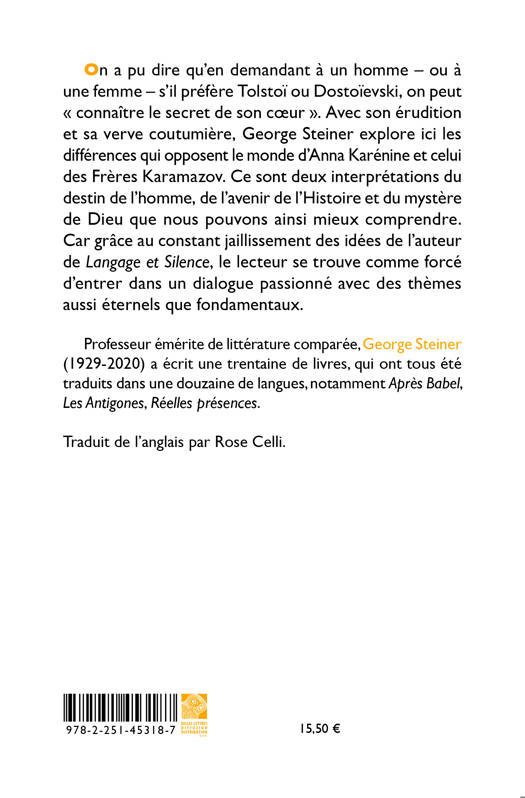 On a pu dire qu'en demandant a un homme - ou a une femme - s'il prefere Tolstoi ou Dostoievski, on peut connaitre le secret de son coeur. Avec son erudition et sa verve coutumiere, George Steiner explore ici les differences qui opposent le monde d'Anna Karenine et celui des Freres Karamazov. Ce sont deux interpretations du destin de l'homme, de l'avenir de l'Histoire et du mystere de Dieu que nous pouvons ainsi mieux comprendre. Car grace au constant jaillissement des idees de l'auteur de Langage et Silence, le lecteur se trouve comme force d'entrer dans un dialogue passionne avec des themes aussi eternels que fondamentaux.