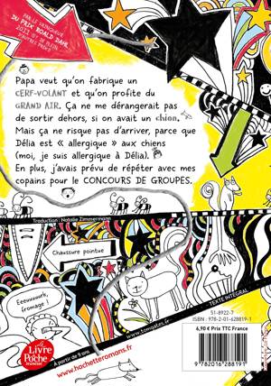 Papa veut qu'on fabrique un cerf-volant et qu'on profite du grand air. Ça ne me dérangerait pas de sortir, si on avait un chien. Mais ça ne risque pas d'arriver, parce que Délia est "allergique" aux chiens (moi je suis allergique à Délia). En plus, j'avais prévu de répéter avec mes copains pour le concours de musique.