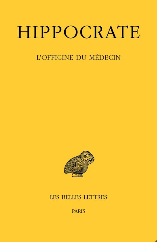 A l'interieur de la Collection hippocratique, le traite intitule Officine du medecin a pour objet d'exposer ce qui se passe a l'interieur du cabinet du medecin qui doit operer un patient dans le cas de blessures, particulierement de fractures ou de luxations. Pour designer le cabinet du medecin, on a conserve le mot traditionnel d' officine , car le cabinet du medecin dans l'Antiquite grecque ne correspond pas exactement a ce que nous entendons actuellement ainsi. La communaute des medecins dans la Grece antique n'etait pas constituee de generalistes et de specialistes, comme c'etait deja le cas en Egypte ancienne, mais tout medecin devait faire des operations et avait donc dans son officine les instruments necessaires pour les realiser. Cela ne signifie pas que les ouvrages de medecine ne pouvaient pas etre specialises. Car dans la Collection hippocratique, il y a deux groupes d'ouvrages specialises, l'un en gynecologie, l'autre en chirurgie. Le traite de l'Officine du medecin appartient au groupe des cinq grands traites chirurgicaux anciens, les quatre autres etant Fractures, Articulations, Mochlique et Blessures de tete. Ce qui distingue ce traite des autres, c'est qu'il ne decrit pas les differentes blessures, fractures et articulations suivant les differentes parties du corps, mais presente, sous forme soit de memento soit d'introduction generale, les differents elements humains ou materiels qui entrent en jeu dans toute operation d'un blesse avant d'en venir dans une seconde partie a une reflexion generale sur ce qui etait considere comme essentiel dans la therapeutique, a savoir les bandages.