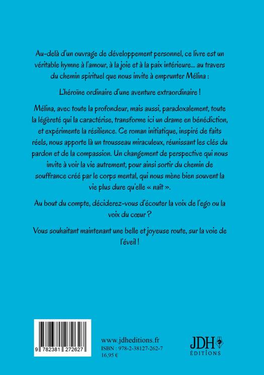 Au-delà d'un ouvrage de développement personnel, ce livre est un véritable hymne à l'amour, à la joie et à la paix intérieure... au travers du chemin spirituel que nous invite à emprunter Mélina : L'héroïne ordinaire d'une aventure extraordinaire ! Mélina, avec toute la profondeur, mais aussi, paradoxalement, toute la légèreté qui la caractérise, transforme ici un drame en bénédiction, et expérimente la résilience. Ce roman initiatique, inspiré de faits réels, nous apporte là un trousseau miraculeux, réunissant les clés du pardon et de la compassion. Un changement de perspective qui nous invite à voir la vie autrement, pour ainsi sortir du chemin de souffrance créé par le corps mental, qui nous mène bien souvent la vie plus dure qu'elle « naît ». Au bout du compte, déciderez-vous d'écouter la voix de l'ego ou la voix du coeur ? Vous souhaitant maintenant une belle et joyeuse route, sur la voie de l'éveil !