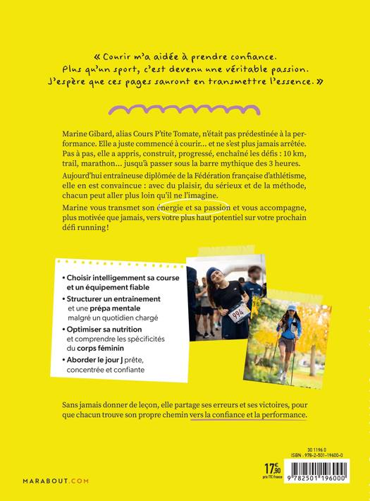 Aujourd’hui entraîneuse diplômée de la Fédération française d’athlétisme, elle en est convaincue : avec du plaisir, du sérieux et de la méthode, chacun peut aller plus loin qu’il ne l’imagine. Marine vous transmet son énergie et sa passion et vous accompagne, plus motivée que jamais, vers votre plus haut potentiel sur votre prochain défi running !