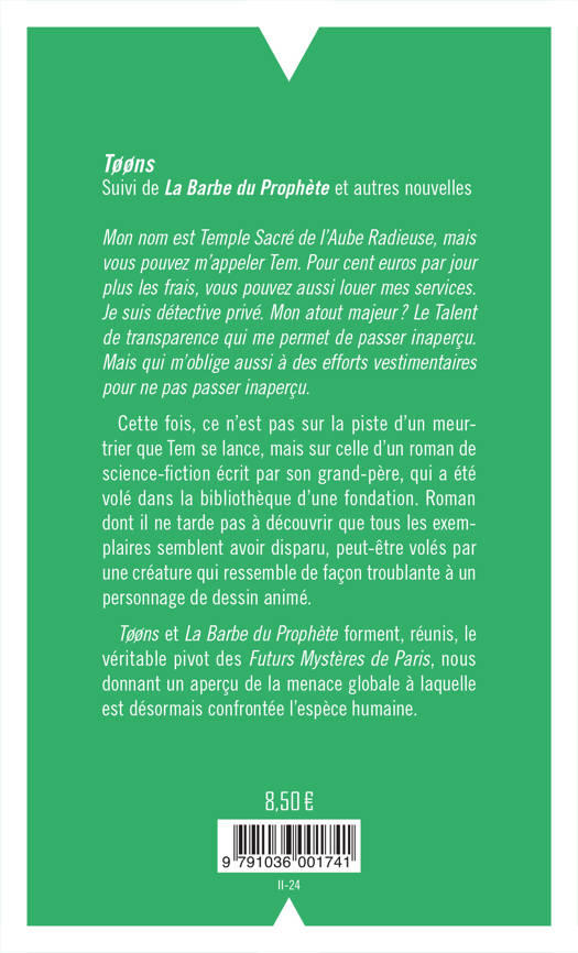 Mon nom est Temple Sacré de l'Aube Radieuse, mais vous pouvez m'appeler Tem. Pour cent euros par jour plus les frais, vous pouvez aussi louer mes services. Je suis détective privé. Mon atout majeur ? Le Talent de transparence qui me permet de passer inaperçu. Mais qui m'oblige aussi à des efforts vestimentaires pour ne pas passer inaperçu.