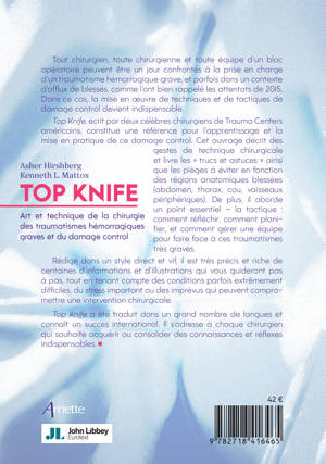 Top Knife est une référence au succès international pour tout chirurgien confronté à la prise en charge d'un traumatisme hémorragique grave, parfois dans un contexte d'afflux de blessés quand la mise en oeuvre de techniques et de tactiques de damage control devient indispensable. Didactique grâce à ses 150 illustrations, il offre des centaines de gestes chirurgicaux détaillés et livre les « trucs et astuces » ainsi que les pièges à éviter en fonction des zones anatomiques blessées (abdomen, thorax, cou, vaisseaux périphériques).
