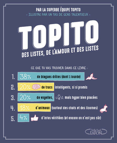 À l'occasion des 10 ans de Topito, nous proposons aux lecteurs un best of regroupant des top listes sous forme de textes, d'infographies et d'illustrations. Un ouvrage pop et funky, drôle, parfois plus sérieux, souvent décalé, et surtout très varié...