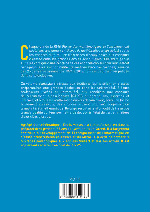 Chaque année la RMS publie les énoncés d'un millier d'exercices d'oraux posés aux concours d'entrée dans les grandes écoles scientifiques. Elle édite par la suite les corrigés d'une centaine de ces énoncés choisis pour leur intérêt pédagogique ou leur originalité. Ce sont ces exercices corrigés, issus de ces 25 dernières années (de 1994 à 2018), qui sont aujourd'hui publiés dans cette collection.