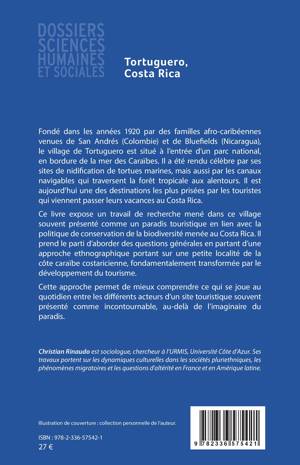 Fondé dans les années 1920 par des familles afro-caribéennes venues de San Andrés (Colombie) et de Bluefields (Nicaragua), le village de Tortuguero est situé à l'entrée d'un parc national, en bordure de la mer des Caraïbes. Il a été rendu célèbre par ses sites de nidification de tortues marines, mais aussi par les canaux navigables qui traversent la forêt tropicale aux alentours. Il est aujourd'hui une des destinations les plus prisées par les touristes qui viennent passer leurs vacances au Costa Rica. Ce livre expose un travail de recherche mené dans ce village souvent présenté comme un paradis touristique en lien avec la politique de conservation de la biodiversité menée au Costa Rica. Il prend le parti d'aborder des questions générales en partant d'une approche ethnographique portant sur une petite localité de la côte caraïbe costaricienne, fondamentalement transformée par le développement du tourisme. Cette approche permet de mieux comprendre ce qui se joue au quotidien entre les différents acteurs d'un site touristique souvent présenté comme incontournable, au-delà de l'imaginaire du paradis.