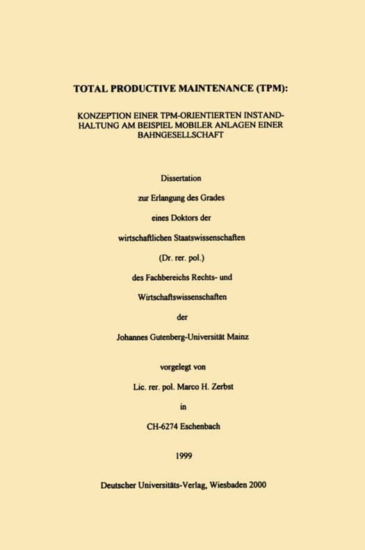 Marco Zerbst identifiziert Problemfelder und Erfolgsfaktoren für die Einführung von TPM. Am Beispiel mobiler Anlagen einer Bahngesellschaft untersucht er ein potenzielles Implementierungsfeld; die gewonnenen Erkenntnisse lassen sich jedoch auf weitere Dienstleistungs- und Industrieunternehmen übertragen.