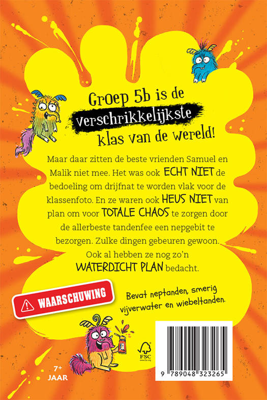 Maar daar zitten de beste vrienden Samuel en Malik niet mee. Het was ook ECHT NIET de bedoeling om drijfnat te worden vlak voor de klassenfoto. En ze waren ook HEUS NIET van plan om voor TOTALE CHAOS te zorgen door de allerbeste tandenfee een nepgebit te bezorgen. Zulke dingen gebeuren gewoon. Ook al hebben ze nog zo’n WATERDICHT PLAN bedacht.