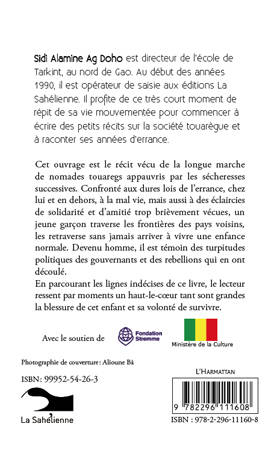 Cet ouvrage est le récit vécu de la longue marche de nomades appauvris par les sécheresses successives. Confronté aux dures lois de l'errance, chez lui et en dehors, à la mal vie, mais aussi à des éclaircies de solidarité et d'amitié brièvement vécues, un jeune garçon traverse les frontières des pays voisins, les retraverse sans jamais arriver à vivre une enfance normale. Devenu homme, il est témoin des turpitudes politiques des gouvernants et des rebellions qui en ont découlé.