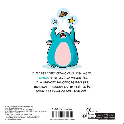 Il y a des jours comme ça où rien ne va. Toublou s'est levé du mauvais pied. Il a vraiment pas envie de rigoler ! Ronchon et bougon, notre petit lapin devient le champion des grognons !