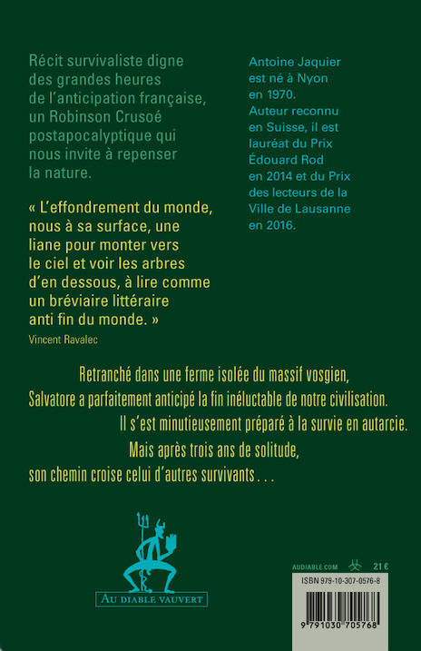 Récit survivaliste digne des grandes heures de l’anticipation française, un Robinson Crusoé postapocalyptique qui nous invite à repenser la nature.