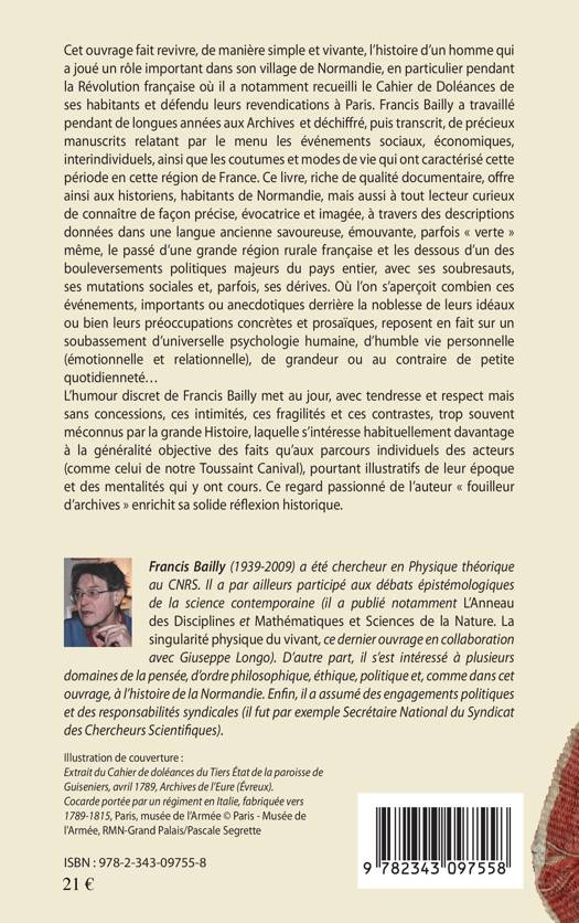 Cet ouvrage fait revivre l'histoire d'un homme qui a joué un rôle important dans son village de Normandie, en particulier pendant la Révolution française où il a recueilli le Cahier de Doléances de ses habitants et défendu leurs revendications à Paris. Francis Bailly a travaillé pendant de longues années aux Archives et déchiffré, puis transcrit, de précieux manuscrits. Ce livre offre à tous les lecteurs le passé d'une grande région rurale française et les dessous d'un des bouleversements politiques majeurs du pays entier.