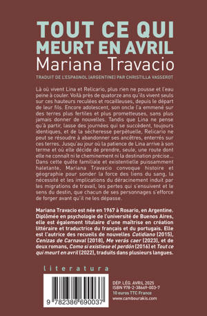Là où vivent Lina et Relicario, plus rien ne pousse et l'eau peine à couler. Voilà près de quatorze ans qu'ils vivent seuls sur ces hauteurs reculées et rocailleuses, depuis le départ de leur fils. Encore adolescent, son oncle l'a emmené sur des terres plus fertiles et plus prometteuses, sans plus jamais donner de nouvelles. Tandis que Lina ne pense qu'à partir, lasse des journées qui se succèdent, toujours identiques, et de la sécheresse perpétuelle, Relicario ne peut se résoudre à abandonner ses ancêtres, enterrés sur ces terres. Jusqu'au jour où la patience de Lina arrive à son terme et où elle décide de prendre, seule, une route dont elle ne connaît ni le cheminement ni la destination précise... Dans cette quête familiale et existentielle puissamment haletante, Mariana Travacio convoque histoire et géographie pour sonder la force des liens du sang, la nécessité et les implications du déracinement induit par les migrations de travail, les pertes qui s'ensuivent et le sens du destin, que chacun de ses personnages s'efforce de forger avant qu'il ne les dépasse.