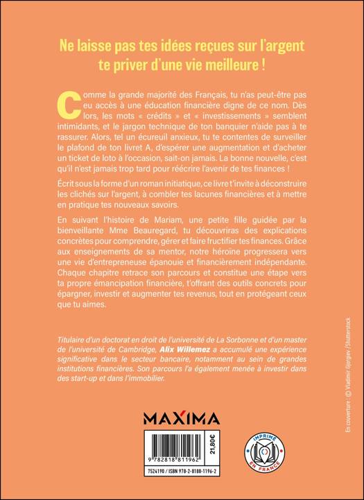 En suivant l’histoire de Mariam, une petite fille guidée par la bienveillante Mme Beauregard, tu découvriras des explications concrètes pour comprendre, gérer et faire fructifier tes finances. Grâce aux enseignements de sa mentor, notre héroïne progressera vers une vie d’entrepreneuse épanouie et financièrement indépendante. Chaque chapitre retrace son parcours et constitue une étape vers ta propre émancipation financière, t’offrant des outils concrets pour épargner, investir et augmenter tes revenus, tout en protégeant ceux que tu aimes.