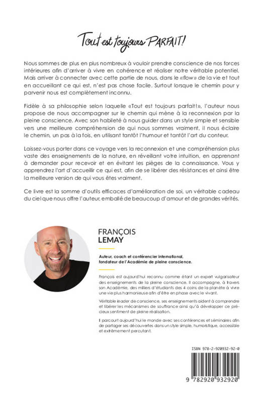 Nous sommes de plus en plus nombreux à vouloir prendre conscience de nos forces intérieures afin d’arriver à vivre en cohérence et réaliser notre véritable potentiel. Mais arriver à connecter avec cette partie de nous, dans le « flow » de la vie et tout en accueillant ce qui est, n’est pas chose facile. Surtout lorsque le chemin pour y parvenir nous est complètement inconnu. Fidèle à sa philosophie selon laquelle « Tout est toujours parfait ! », l’auteur nous propose de nous accompagner sur le chemin qui mène à la reconnexion par la pleine conscience. Avec son habileté à nous guider dans un style simple et sensible vers une meilleure compréhension de qui nous sommes vraiment, il nous éclaire le chemin, un pas à la fois, en utilisant tantôt l’humour et tantôt l’art du conteur. Laissez-vous porter dans ce voyage vers la reconnexion et une compréhension plus vaste des enseignements de la nature, en réveillant votre intuition, en apprenant à demander pour recevoir et en évitant les pièges de la connaissance. Vous y apprendrez l’art d’accueillir ce qui est, afin de se libérer des résistances et ainsi être la meilleure version de qui vous êtes vraiment. Ce livre est la somme d’outils efficaces d’amélioration de soi, un véritable cadeau du ciel que nous offre l’auteur, emballé de beaucoup d’amour et de grandes vérités.