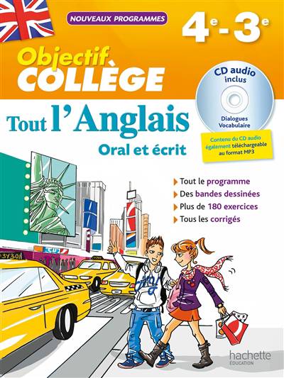 Nouveaux programmesUn cahier + un CD audio + des bandes dessinées pour progresser très vite à l’oral comme à l’écrit !Tout le programme d’anglais de la 4e et de la 3e, en vingt leçons : vocabulaire, grammaire, compréhension et expression écrites et orales. Chaque leçon vous propose :• Une