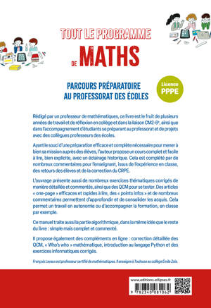 Cet ouvrage tout le contenu du programme de la Licence PPPE en Mathématiques (de la L1 à la L3) et proposent de faire le point sur les connaissances attendues à la fin de la licence, c’est-à-dire pour l’entrée en Master MEEF au cours duquel les étudiants préparent le CRPE.