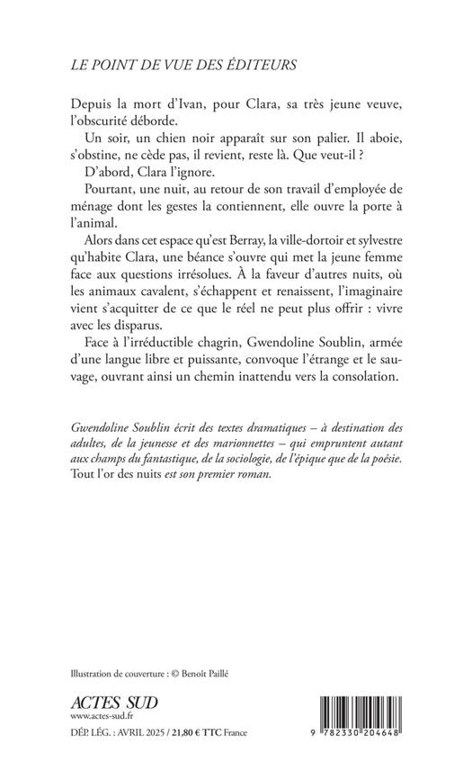 Depuis la mort d'Ivan, pour Clara, sa très jeune veuve, l'obscurité déborde. Un soir, un chien noir apparaît sur son palier. Il aboie, s'obstine, ne cède pas, il revient, reste là. Que veut-il ? D'abord, Clara l'ignore. Pourtant, une nuit, au retour de son travail d'employée de ménage dont les gestes la contiennent, elle ouvre la porte à l'animal. Alors dans cet espace qu'est Berray, la ville-dortoir et sylvestre qu'habite Clara, une béance s'ouvre qui met la jeune femme face aux questions irrésolues. À la faveur d'autres nuits, où les animaux cavalent, s'échappent et renaissent, l'imaginaire vient s'acquitter de ce que le réel ne peut plus offrir : vivre avec les disparus. Face à l'irréductible chagrin, Gwendoline Soublin, armée d'une langue libre et puissante, convoque l'étrange et le sauvage, ouvrant ainsi un chemin inattendu vers la consolation.