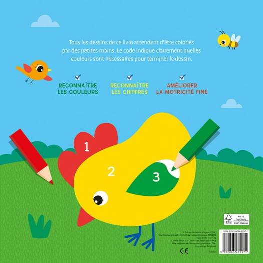 Tous les dessins de ce livre attendent d'être coloriés par des petites mains. Le code indique clairement quelles couleurs sont nécessaires pour terminer le dessin. RECONNAÎTRE LES COULEURS RECONNAÎTRE LES CHIFFRES AMÉLIORER LA MOTRICITÉ FINE