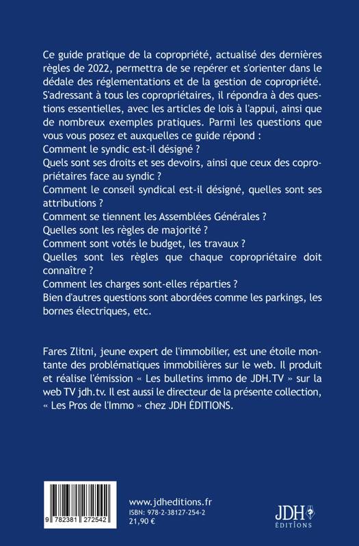 Ce guide pratique de la copropriété, actualisé des dernières règles de 2022, permettra de se repérer et s'orienter dans le dédale des réglementations et de la gestion de copropriété. S'adressant à tous les copropriétaires, il répondra à des questions essentielles, avec les articles de lois à l'appui, ainsi que de nombreux exemples pratiques. Parmi les questions que vous vous posez et auxquelles ce guide répond : Comment le syndic est-il désigné ? Quels sont ses droits et ses devoirs, ainsi que ceux des copropriétaires face au syndic ? Comment le conseil syndical est-il désigné, quelles sont ses attributions ? Comment se tiennent les Assemblées Générales ? Quelles sont les règles de majorité ? Comment sont votés le budget, les travaux ? Quelles sont les règles que chaque copropriétaire doit connaître ? Comment les charges sont-elles réparties ? Bien d'autres questions sont abordées comme les parkings, les bornes électriques, etc. Fares Zlitni, jeune expert de l'immobilier, est une étoile montante des problématiques immobilières sur le web. Il produit et réalise l'émission « Les bulletins immo de JDH.TV » sur la web TV jdh.tv. Il est aussi le directeur de la présente collection, « Les Pros de l'Immo » chez JDH ÉDITIONS.