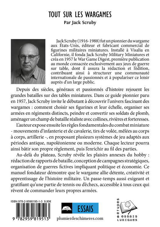 Depuis des siècles, généraux et passionnés d’histoire rejouent les grandes batailles sur des tables miniatures. Dans ce guide pionnier paru en 1957, Jack Scruby invite le débutant à découvrir l’univers fascinant des wargames : comment choisir ses figurines et leur échelle, organiser ses armées en régiments distincts, peindre et convertir ses soldats de plomb, aménager un champ de bataille réaliste avec collines, rivières et forteresses. L’auteur expose ensuite les règles fondamentales du combat miniature - mouvements d’infanterie et de cavalerie, tirs de volée, mêlées au corps à corps, artillerie -, en proposant plusieurs systèmes de jeu adaptés aux périodes antique, napoléonienne ou moderne. Chaque lecteur pourra ainsi bâtir son propre règlement, puis l’enrichir au fil des parties. Au-delà du plateau, Scruby révèle les plaisirs annexes du hobby : rédaction de rapports de bataille, conception de campagnes stratégiques, organisation de guerres fictives impliquant politique et économie. Ce manuel fondateur démontre que le wargame allie détente, créativité et apprentissage de l’histoire militaire. Un passe-temps aussi exigeant et gratifiant qu’une partie de tennis ou d’échecs, accessible à tous ceux qui rêvent de commander leurs propres armées.