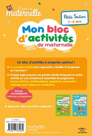 Chaque page propose une grande activité attrayante et variée, centrée sur une compétence essentielle du programme : lecture, écriture, mathématiques, graphisme, observation, repérage dans l’espace et vocabulaire.
