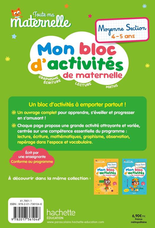 Chaque page propose une grande activité attrayante et variée, centrée sur une compétence essentielle du programme : lecture, écriture, mathématiques, graphisme, observation, repérage dans l’espace et vocabulaire.