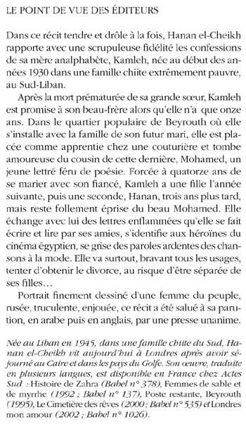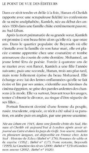 Dans ce récit tendre et drôle à la fois, Hanan el-Cheikh rapporte avec une scrupuleuse fi délité les confessions de sa mère analphabète, Kamleh, née au début des années 1930 dans une famille chiite extrêmement pauvre, au Sud-Liban.