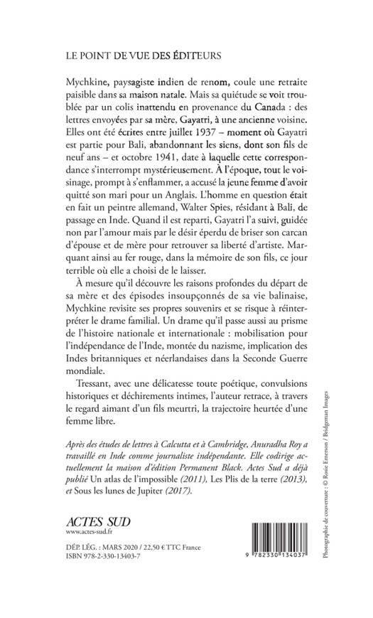 Mychkine, paysagiste indien de renom, coule une retraite paisible dans sa maison natale. Mais sa quiétude se voit troublée par un colis inattendu en provenance du Canada : des lettres envoyées par sa mère, Gayatri, à une ancienne voisine. Elles ont été écrites entre juillet 1937 - moment où Gayatri est partie pour Bali, abandonnant les siens, dont son fils de neuf ans - et octobre 1941, date à laquelle cette correspondance s'interrompt mystérieusement. À l'époque, tout le voisinage, prompt à s'enflammer, a accusé la jeune femme d'avoir quitté son mari pour un Anglais. L'homme en question était en fait un peintre allemand, Walter Spies, résidant à Bali, de passage en Inde. Quand il est reparti, Gayatri l'a suivi, guidée non par l'amour mais par le désir éperdu de briser son carcan d'épouse et de mère pour retrouver sa liberté d'artiste. Marquant ainsi au fer rouge, dans la mémoire de son fils, ce jour terrible où elle a choisi de le laisser.