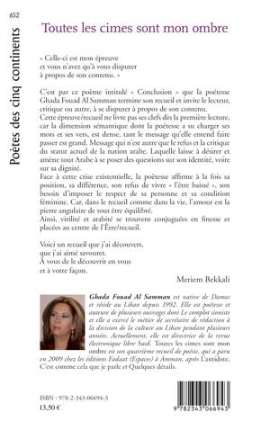 Ghada Fouad Al Samman invite le lecteur, critique ou autre, à se disputer à propos de son contenu. Cette épreuve/ recueil ne livre pas ses clefs dès la première lecture, car la dimension sémantique dont la poétesse a su charger ses mots et ses vers, est dense, tant le message qu'elle entend faire passer est grand.