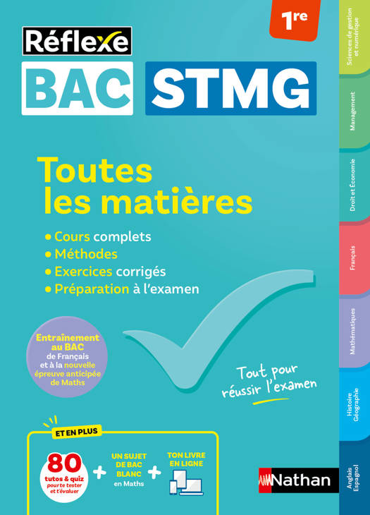 (Droit et Économie, Management, Sciences de gestion et numérique, Mathématiques, Français, Histoire-Géographie, Anglais, Espagnol), et offre une préparation exhaustive à l'examen.