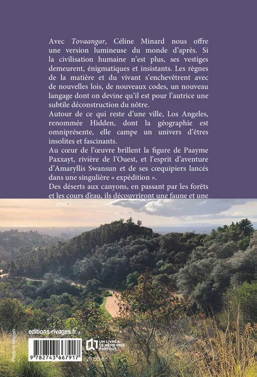 Sélection du prix Médicis Avec Tovaangar, Céline Minard nous offre une version lumineuse du monde d'après. Si la civilisation humaine n'est plus, ses vestiges demeurent, énigmatiques et insistants. Les règnes de la matière et du vivant s'enchevêtrent avec de nouvelles lois, de nouveaux codes, un nouveau langage dont on devine qu'il est pour l'autrice une subtile déconstruction du nôtre. Autour de ce qui reste d'une ville, Los Angeles, renommée Hidden, dont la géographie est omniprésente, elle campe un univers d'êtres insolites et fascinants. Au coeur de l'oeuvre brillent la figure de Paayme Paxaayt, rivière de l'Ouest, et l'esprit d'aventure d'Amaryllis Swansun et de ses coequipiers lancés dans une singulière « expédition ». Des déserts aux canyons, en passant par les forêts et le cours de l'eau, ils découvriront une faune et une flore luxuriantes, mais aussi des cultures ayant tissé un lien inédit avec leur environnement. Porté par une écriture à la croisée des genres et à l'ampleur inégalée, ce roman au souffle épique nous emporte dans une aventure littéraire inouïe.