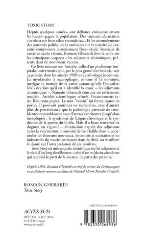 Ce livre raconte son histoire, celle d'un professeur hospitalo-universitaire qui, par le plus grand des hasards, voit apparaître dans les années 1990 une pathologie inconnue. La myofasciite à macrophages, comme il l'a nommée, intrigue le monde de la santé autant qu'elle l'inquiète. Mais dès lors qu'il en a identifié la cause - les adjuvants aluminiques -, Romain Gherardi constate un revirement soudain. Articles scientifiques refusés. Financements taris. Réunions pipées. Le mot "vaccin" lui ferme toutes les portes. Il poursuit pourtant ses recherches, avec d'autant plus de persévérance que la pathologie présente de troublantes ressemblances avec d'autres syndromes jusqu'alors inexpliqués : le syndrome de fatigue chronique et le syndrome de la guerre du Golfe. Mais il a beau renverser les dogmes en vigueur - élimination rapide des adjuvants après la vaccination, innocuité de leur faible dose -, accumuler les éléments nouveaux, les autorités sanitaires et les industriels du vaccin persistent dans le déni, ou instillent le doute sur l'interprétation de ses résultats.