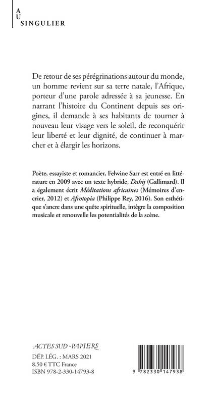 De retour de ses pérégrinations autour du monde, un homme revient sur sa terre natale, l'Afrique, porteur d'une parole adressée à la jeunesse. En narrant l'histoire du Continent depuis ses origines, il demande à ses habitants de tourner à nouveau leur visage vers le soleil, de reconquérir leur liberté et leur dignité, de continuer à marcher et à élargir les horizons.