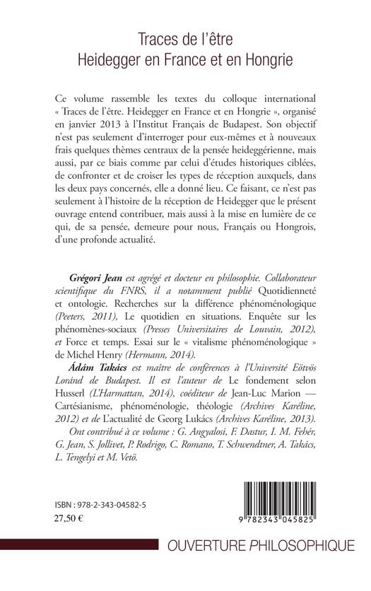 Ce volume rassemble les textes du colloque international « Traces de l'être. Heidegger en France et en Hongrie », organisé à l'Institut Français de Budapest. Ce n'est pas seulement à l'histoire de la réception de Heidegger que le présent ouvrage entend contribuer, mais aussi à la mise en lumière de ce qui, de sa pensée, demeure pour nous, Français ou Hongrois, d'une profonde actualité.